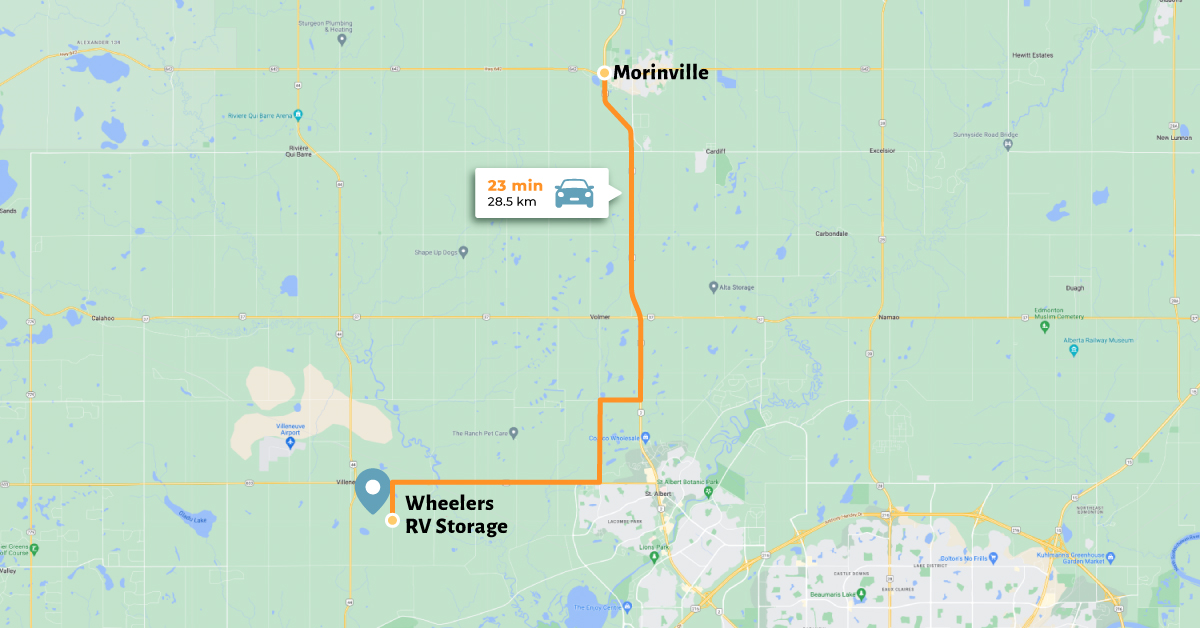 RV storage could not be any more easier for Morinville! There is no need to leave your RV in your driveway, when there is Wheelers’ RV Storage service to do the job for you, simply drop your vehicle off and well take care of the rest. With only a 23 minute ride from southwest of Morinville we promise to keep you RV safe and sound.
